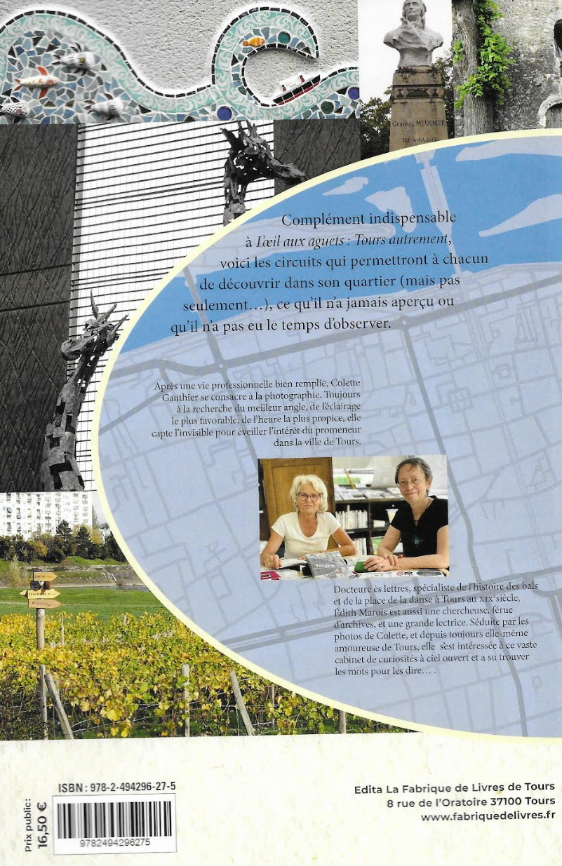 Nous nous sommes rencontrées lors d’une de mes expositions photos. L’idée d’ajouter des légendes aux clichés a cheminé en nous et... quatre ans plus tard, le livre « L’œil aux aguets : Tours autrement » a vu le jour. L’envie de susciter la curiosité dans les « petits riens » de l’environnement quotidien et l’intérêt pour l’histoire de ce patrimoine vernaculaire a dirigé Édith Marois vers les archives et les bibliothèques. Tout ce qui se voit de la rue en flânant, en marchant ou en pédalant est le fil conducteur de cet ouvrage qui comprend 17 chapitres thématiques.